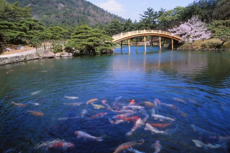 回遊式庭園といえば、池を中心としたまとまりのある庭園空間を次々に巡っていくことが特徴。そして、池といえば、やっぱり美しい錦鯉が泳いでいる図が、皆さん浮かんできませんか? 栗林公園でも、園内いろいろなところで錦鯉が優美に泳ぐ姿を楽しんでいただいています。