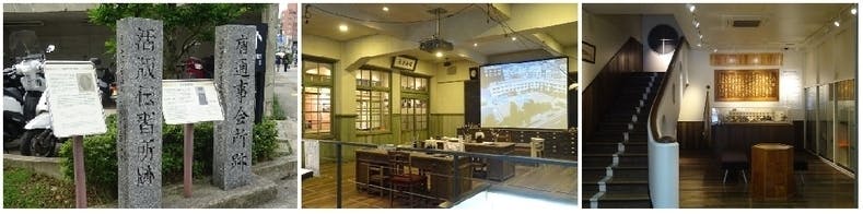 ▲(左)活版伝習所跡と唐通事会所跡の石碑 (中央)救護所メモリアル (右)新興善メモリアル