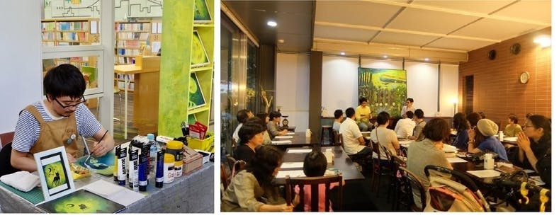 ▲(左)田川誠さん (右)図書館で行ったトークイベントの様子