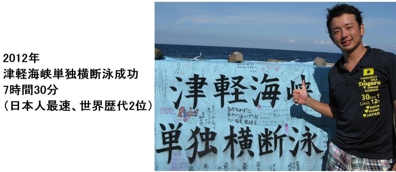 2012年に国内最難関の津軽海峡の単独横断泳に挑戦し、それまでの世界記録を2時間以上短縮して当時の世界最速記録で成功。日本人2人目の成功者。