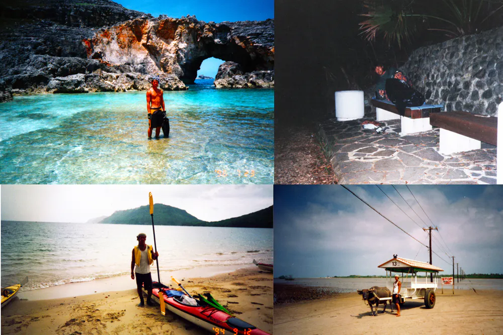 《道のない所はカヤックで、西表島。お供え物や乞食の人達にも食べ物を分けてもらったりしながらの生活》