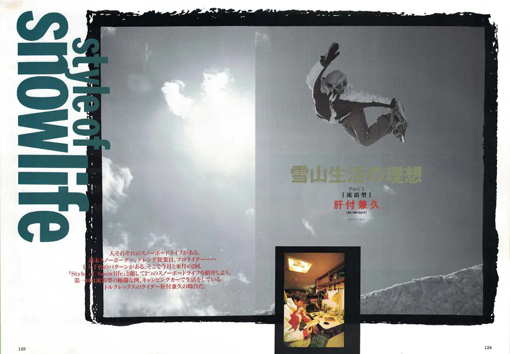冬の間は寒く生活が困難になるので雪山に篭るようになり、夏は旅 冬は雪籠りという生活が続く。トマム、キロロ、アライリゾート、ニュージーランドのコロネットピーク、白馬乗鞍、アクシオムと数々のスキー場に冬は篭り、夏は放浪を繰り返し、気づいたらプロスノーボーダーになる。