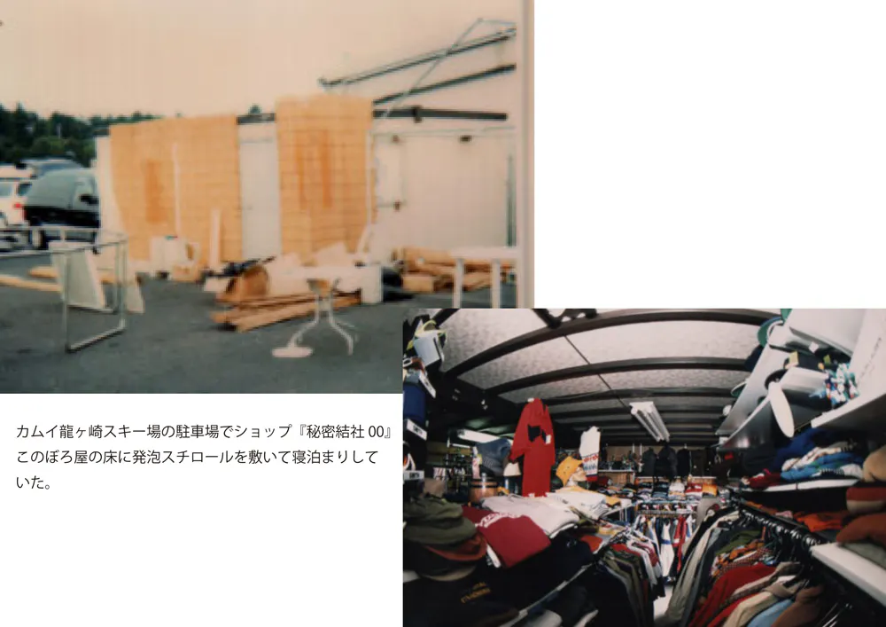 契約勤務していた、カムイ龍ヶ崎スキー場の駐車場で今のスノーボードプロショップ ソサイアティ01の前進となる秘密結社00を家賃を支払い開業する。工事現場で使われている、ボロボロのスーパーハウスを購入してショップとした、貧しさのあまり床で寝泊まりし、ネズミに自身のほぼ持っていない服を食べらながら、ほぼ寝ずに3年働き資金を貯めて独立、起業にこぎつけた。