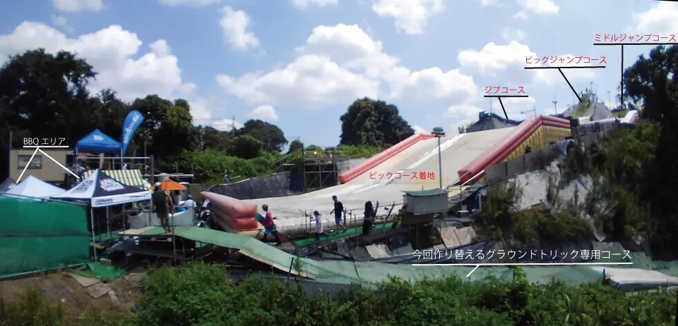 このフライヒルつくばみらいジャンプスキー場にジャンプだけではなく、 世界で初となるエッジを削らないでそのまま滑れる、そしてクッションで転んでも痛くない、スノーボードやスキーでグラウンドトリックする為のサマーゲレンデコースを作りたい!!