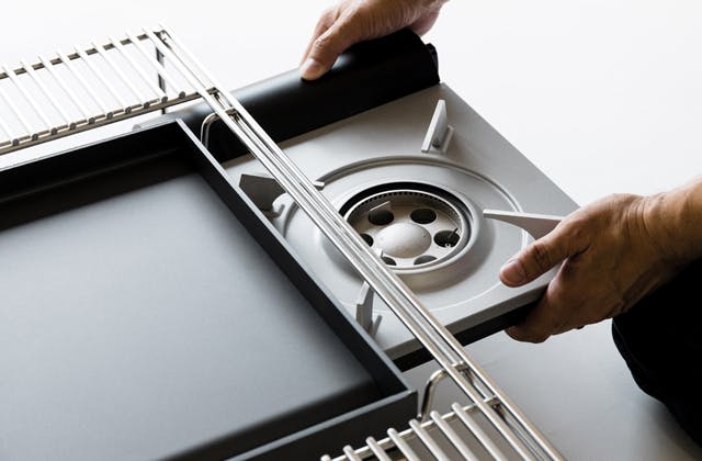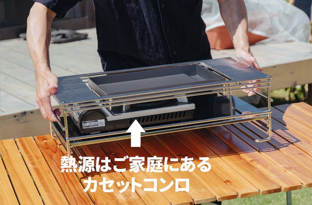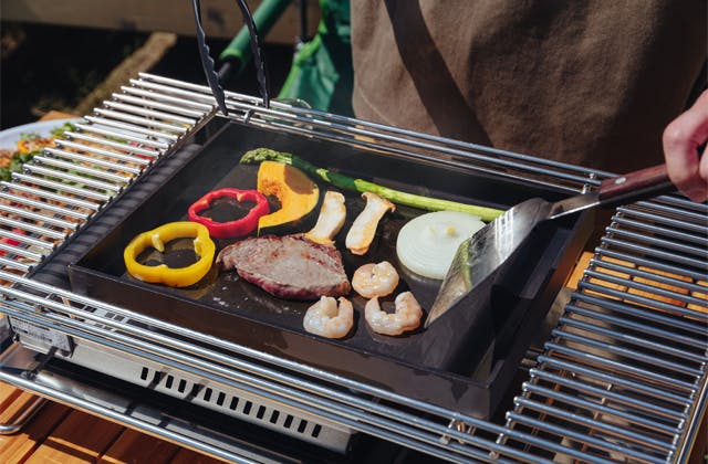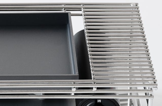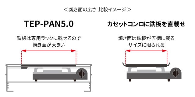 そこでTEP-PAN5.0は、鉄板を丈夫なステンレス製の専用ラックに載せる仕様としました。こうすることで鉄板は常に安定し、カセットコンロのサイズとは関係なく大きな焼き面を得ることができます。
