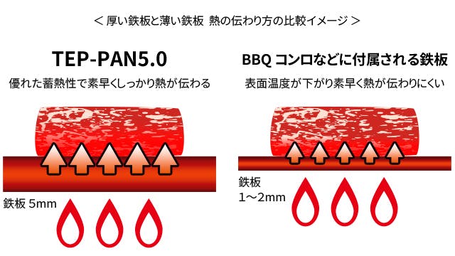 TEP-PAN5.0 の鉄板は極厚の5mm!予熱をしっかりかければその厚みで優れた蓄熱性を発揮し、表面の温度ムラや食材投入時の温度変化を最小限にします。食材にしっかり熱を加えることができ、“強火で旨みを閉じ込めた” ような調理ができます。