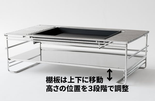 しかし、その重さを受け止める堅牢なステンレス製ラックに一度鉄板を置いてしまえば、調理中は不用意にラックが動いたりせずとても安定感があります。下の棚からいつでもカセットコンロを容易に取り出せるのでカセットガスの交換も簡単です。