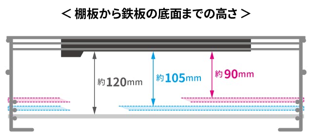 カセットコンロを置くときには、ご家庭にあるカセットコンロの高さに合わせて、棚位置の高さを3段階で調整できます。棚板から鉄板の底面までの高さは、約 90mm、約 105mm、約 120mm です。