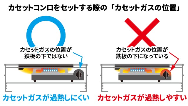 カセットコンロをセットする際は、「カセットガスの位置」に注意してください。鉄板の下にカセットガスをセットすると、カセットガスが過熱して大変危険です。絶対にしないでください。
