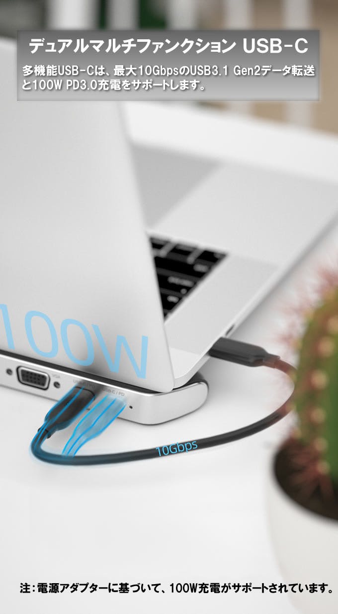多機能USB-Cは、最大10GbpsのUSB3.1 Gen2データ転送と100W PD3.0充電をサポートします。