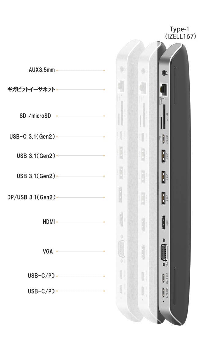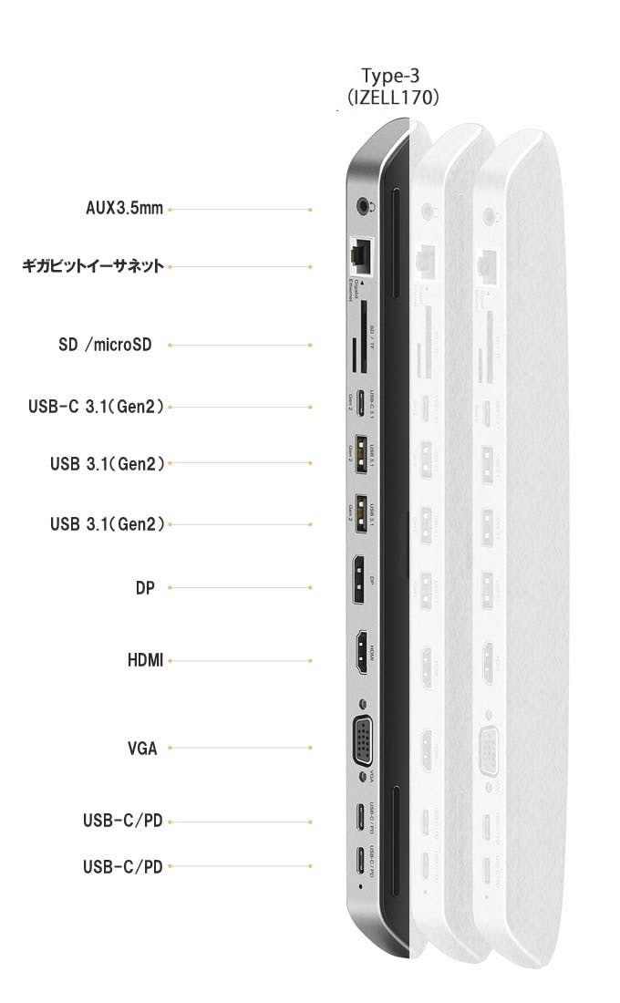 IZELLポータブルドッキングステーションはポートのタイプによって3種類になっています。