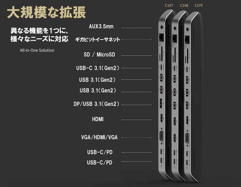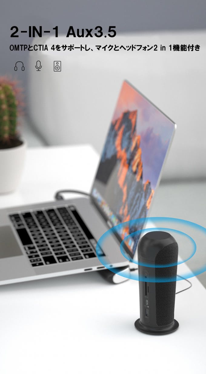 IZELLポータブルドッキングステーションを使用すればUSB3.0x3 + HDMI + VGA + USB-C + SD + TF + AUX3.5 + RJ45等の機能を拡張可能です。