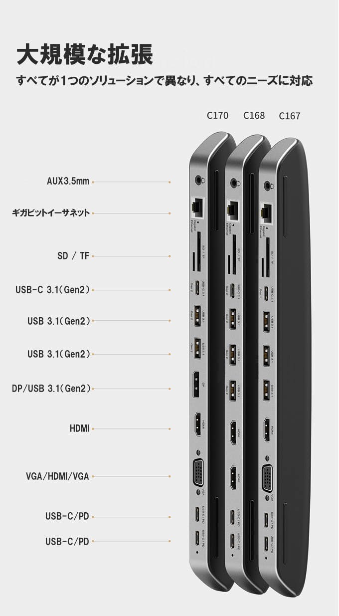 ・出力:USB3.0x3、HDMI、VGA、USB-C、SD、TF、AUX3.5、RJ45