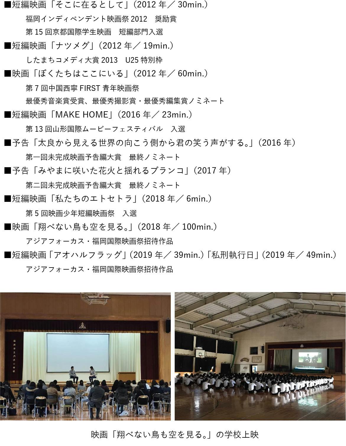 1988年福岡県生まれ 九州大学大学院卒 大学在学中より映画制作を開始。制作当初より、短編を中心に、数多くの映画祭で入選・公式上映。中国の第 7回中国西寧FIRST青年映画祭では、1004本中の10本に選出され、最優秀音楽賞受賞、最優秀撮影賞・最優秀編集賞ノミネート。 2018年「翔べない鳥も空を見る。」劇場公開。いじめ・SNSを題材にした同作は、福岡市内の中学校や小学校で道徳教材としても上映される。気鋭の映画監督のひとりとして、今後の活動が注目されている。 スマートフォンや、SNSなどのデジタルツールの作品への効果的な登用に定評がある。