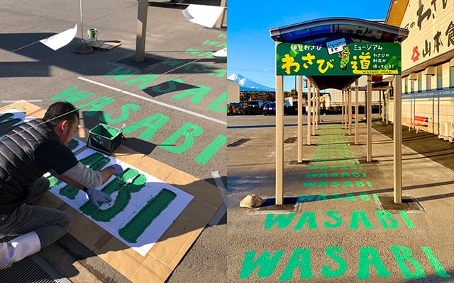 老朽化して非効率で頻繁に使用していない機械を買い替えるなら、雨の日にお客さんが濡れずに店舗まで歩ける屋根付きの通路を作ろう!わさびミュージアムに続く通路で歩いて楽しくなるような「WASABI」の文字が続く通路を♪