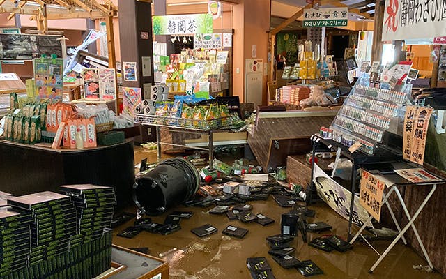 私が到着した時の駐車場はまさに大きな池。若干、水は引いたといえその時点で店舗全体が1mを超える浸水、辺り一面の水に浮く、倒れて無残に壊れた販売台、展示品、そしてすべての商品、冷蔵ケース、製造場の機械、パソコン、レジ、電話、一週間前にすべて取り換えたトイレパーテーション、ウォッシュレット、外の倉庫までもすべてが水没。