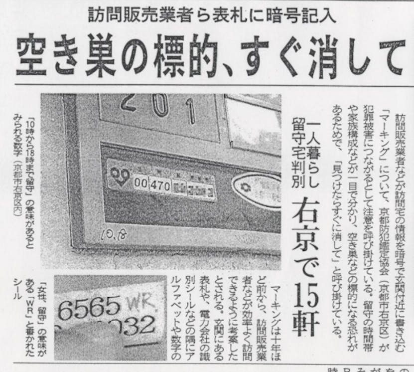 表札部分やドアの縁の部分、インターホン、電気・ガスメーター、などの目立ちにくいところに、記号を書いたりする。