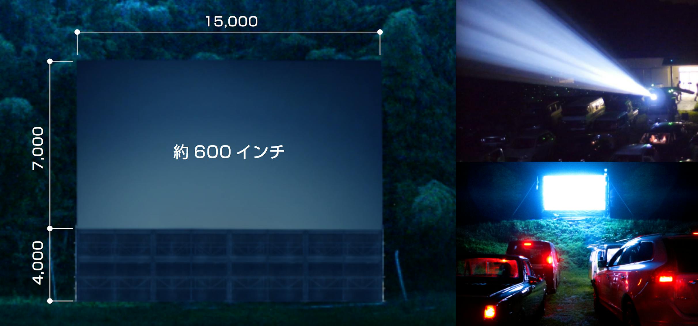 実は今年の7月に、「いとシネマ」で使用している中サイズのスクリーンを使って、テスト的にドライブインシアターを開催したのですが、後方の車だとスクリーンが小さくて映像が見づらいという問題点がわかりました。とくに字幕が表示される洋画などは文字が読めない人が出てきてしまい、訪れた方全員に楽しんでいただけないかもしれない恐れがあるからです。約600インチのスクリーンはシネコンの一般的な幕より大きいサイズなため、ゆったりと間隔を開けて車を配置したとしても十分に映像に没頭することができます。