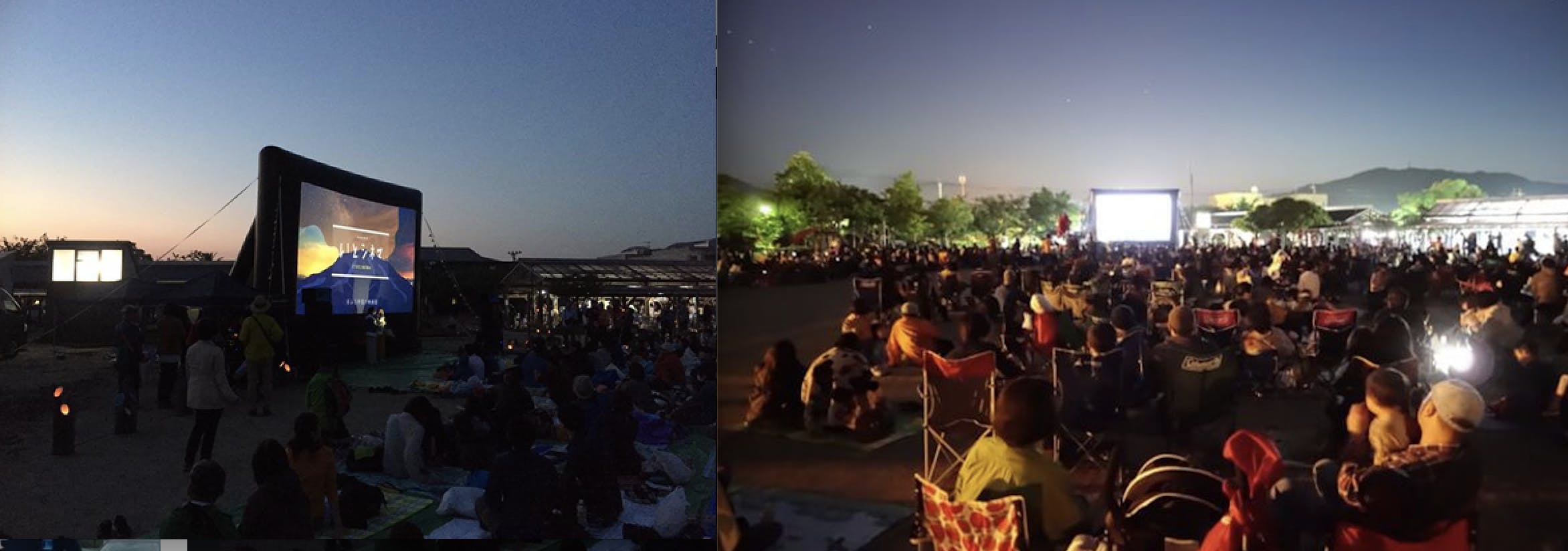 いとシネマの第一回目では予想を遥かに上回る2000人もの来場者に来ていただきました。星空の下で、キャンプチェアやシートに寝転びながらみんなで映画を観る体験が新鮮でした。誰かとシェアしながら観るということがこんなに楽しいんだと実感しました。映画終了後に自然と拍手がおこる雰囲気など、花火大会の終わりに感じる幸福感に似たものがありました。