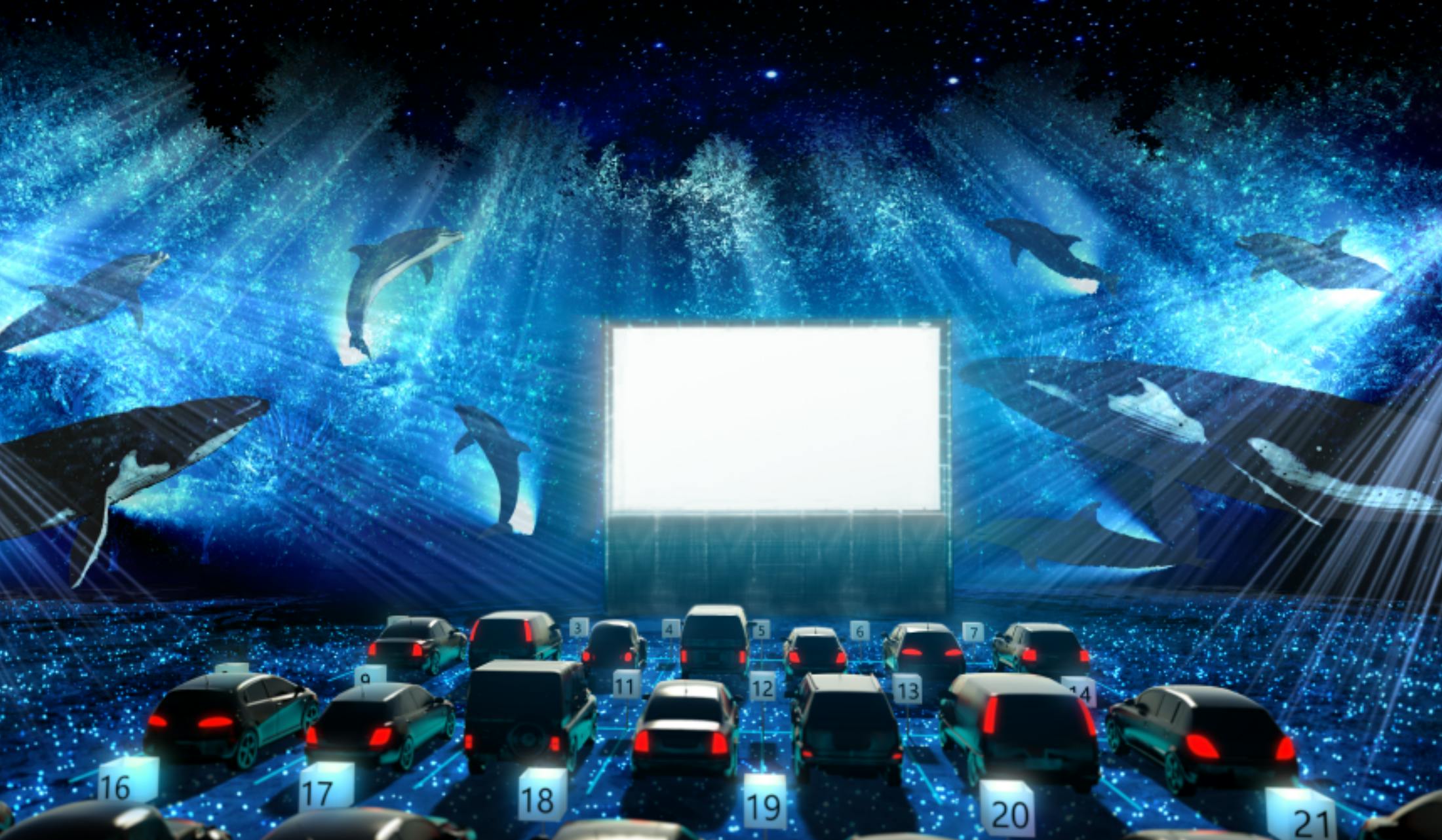 映画を車で観るというドライブインシアターのベースはそのままに、デジタルアートをスクリーンの周囲にも投影して空間全体を演出します。