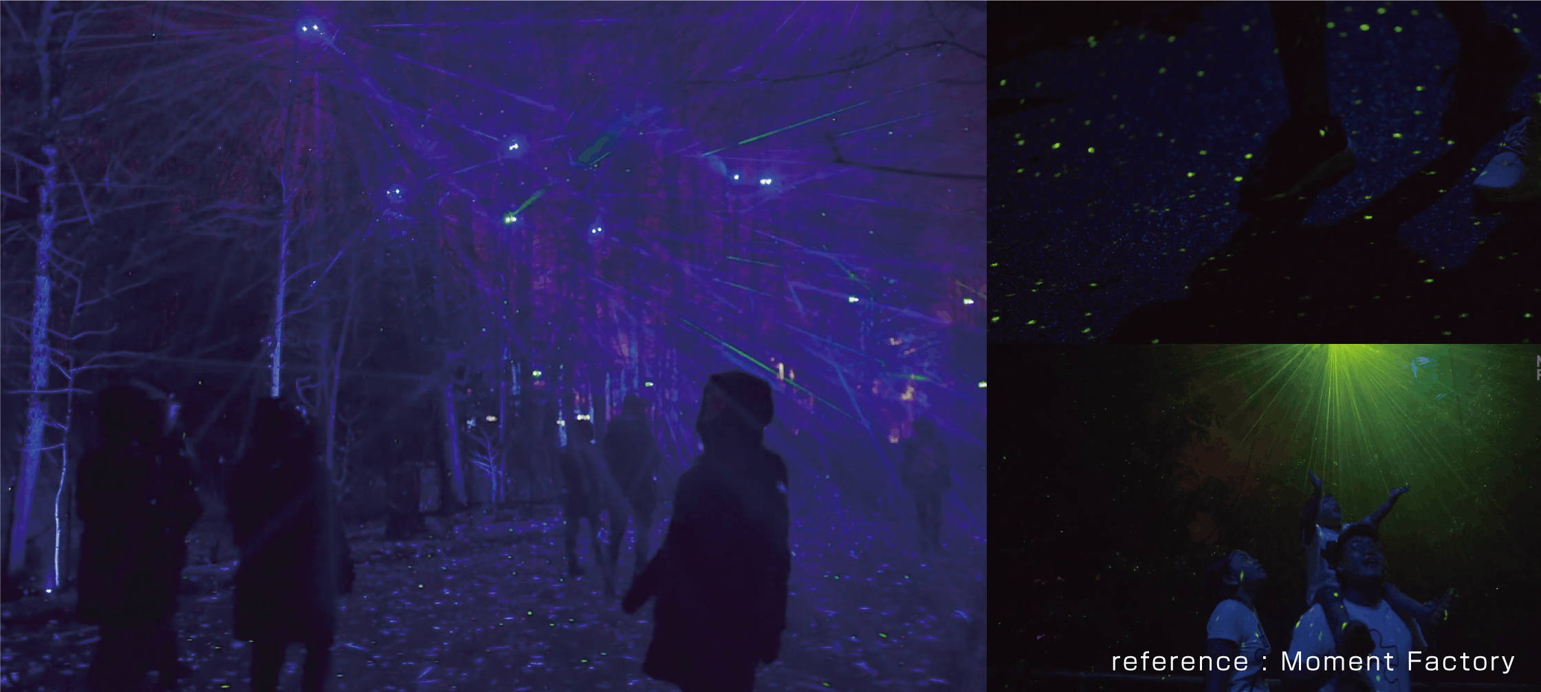 具体的には、会場が森の中にあるというロケーションを生かし、レーザーライトで森や地面全てに星々やホタルの光をデジタルで投射します。窓から上を見上げれば都会では決して見られないような本物の星々。森や地面はデジタルの星々を投影し、リアルとデジタルの星々が融合され星空の中にいるような空間を造りたいと思っています。