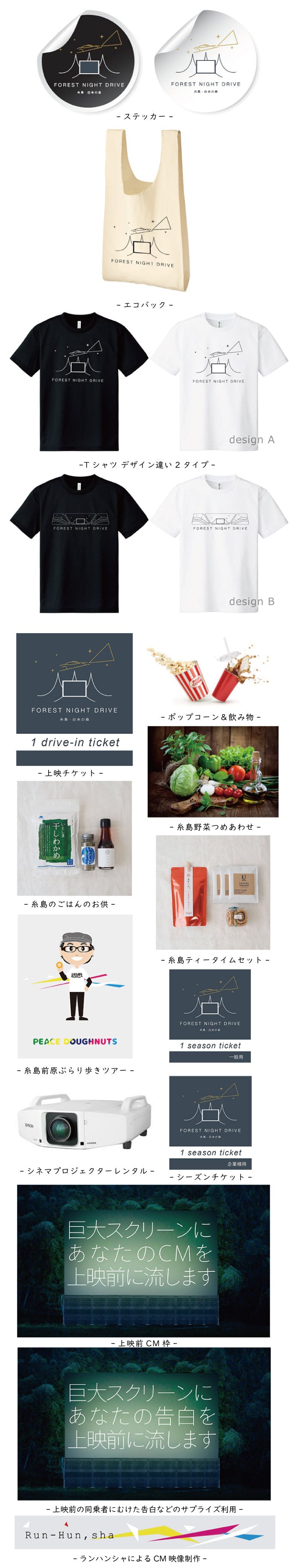 お礼メッセージ、HPお名前掲載、オープニングクレジット、ポップコーン&ドリンク、グッズのシール、エコバック、Tシャツ、糸島野菜、ごはんお供セット、ティータイムセット、映画チケット、前原ぶらり歩きツアー、プロジェクターレンタル、シーズン映画チケット、CM上映権、Drive in Liveなどの場所提供、CM制作など色々準備いたしました。