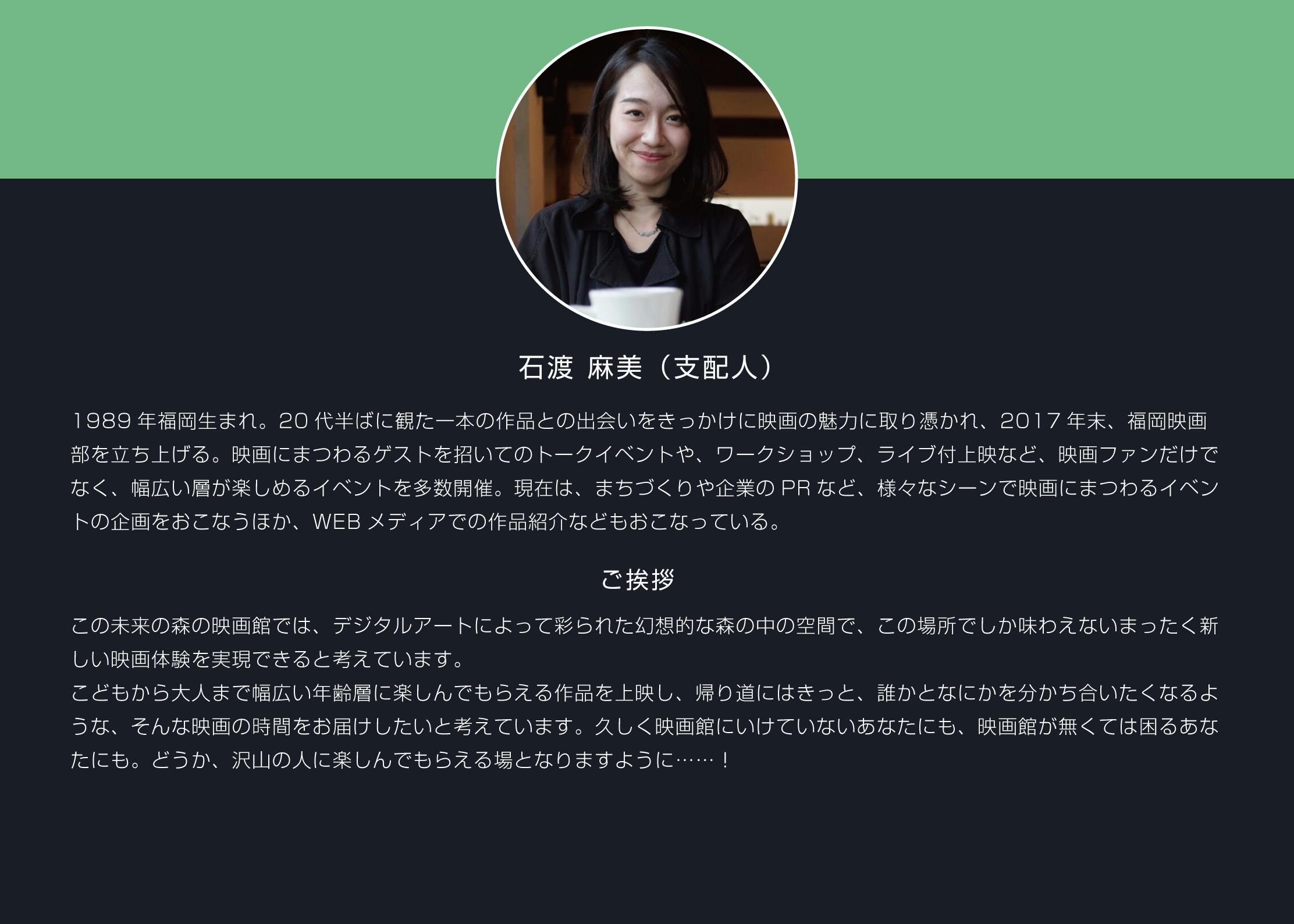 このように映画とデジタル空間を森の中で融合させることは、わたし個人としてはほかに聞いたことがありません。実際、手探りでの挑戦となりますが、映画とデジタルアート、映画と自然を融合させることでひとの新しい感覚を刺激する「未来の映画館の姿」を探っていけたらなと考えています。