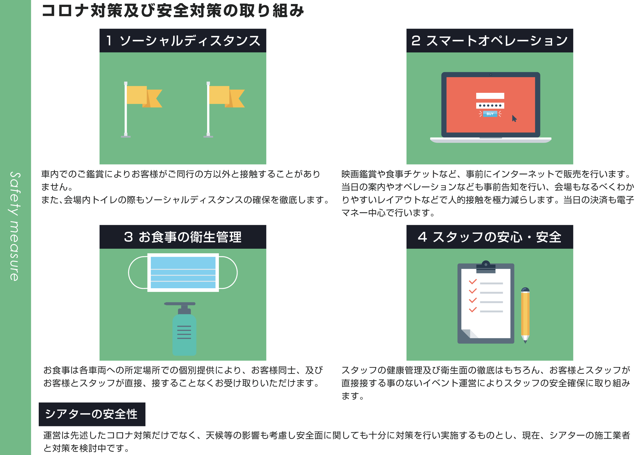 もともと、家族や大切な人と閉じられた空間で映画が楽しめるのが特徴だったドライブインシアター。それがコロナの影響で、感染リスクをできるだけ減らしながら映画を観られる方法として、各地で開催されつつあります。ウィズコロナの時代でもエンターテイメントを諦めない、安心して映画を楽しめる空間を提供したいという想いはわたしたちも同じです。