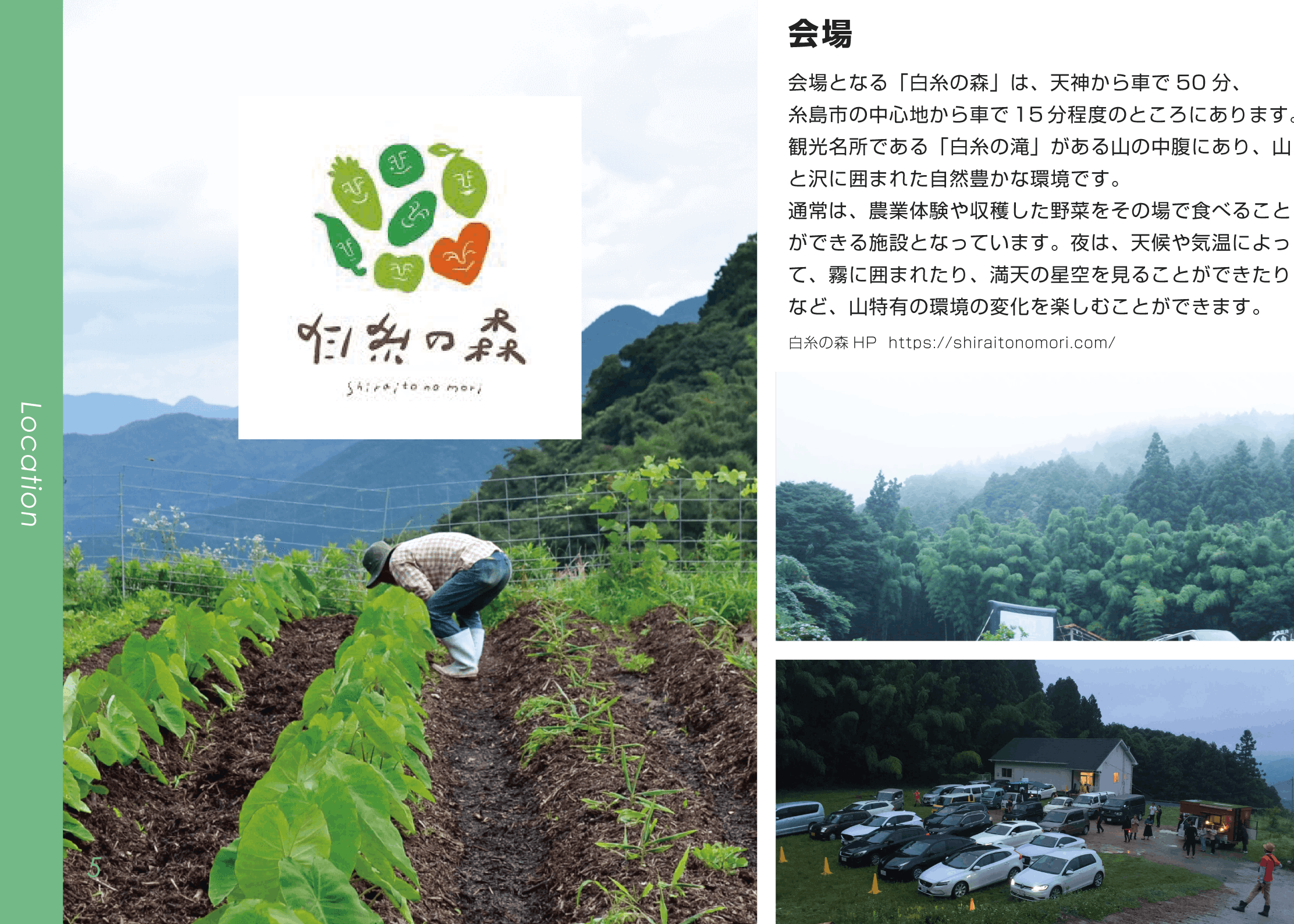 その糸島の南に広がる背振山脈の中腹に、「白糸の滝」という観光名所があります。会場はその滝のたもとにある、「白糸の森」という広場を考えています。「白糸の滝」は糸島の中心部から車で15分ほどの場所にもかかわらず、県指定の名勝にも選定されるほど緑豊かな森のなか。施設内には小川が流れ、山奥なため空は満天の星空、そしてときには幻想的な霧が立ち込める自然を感じられる場所です。