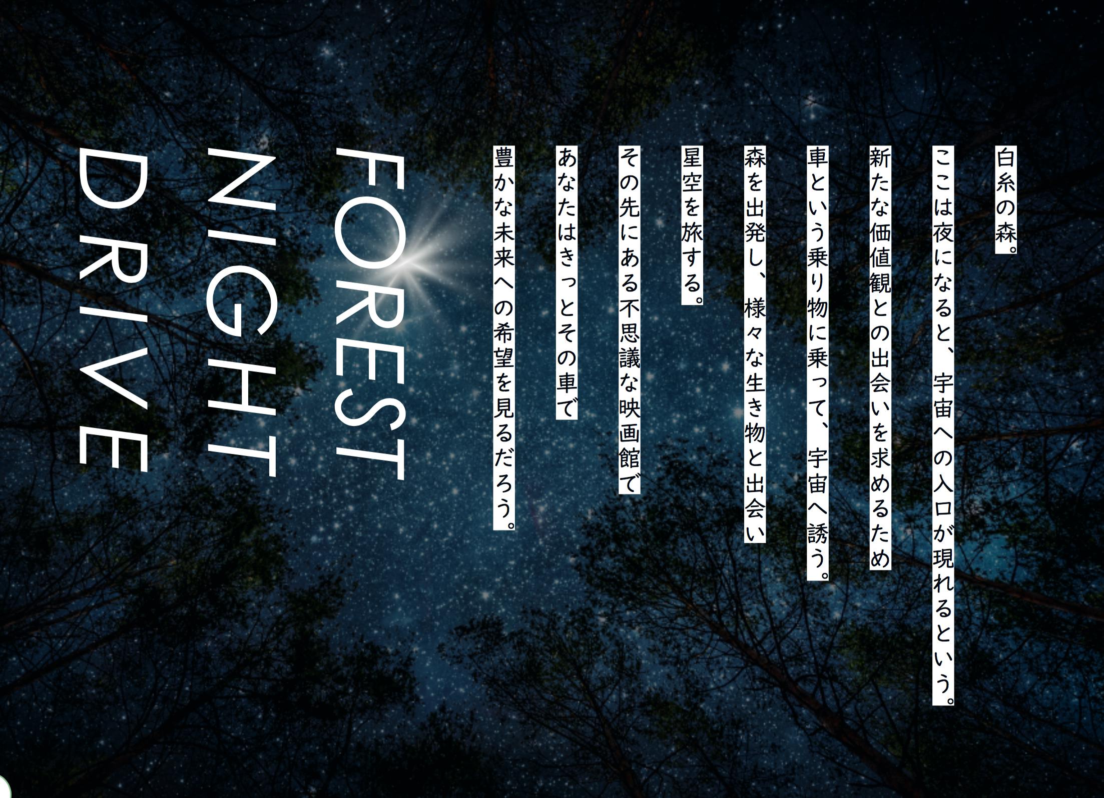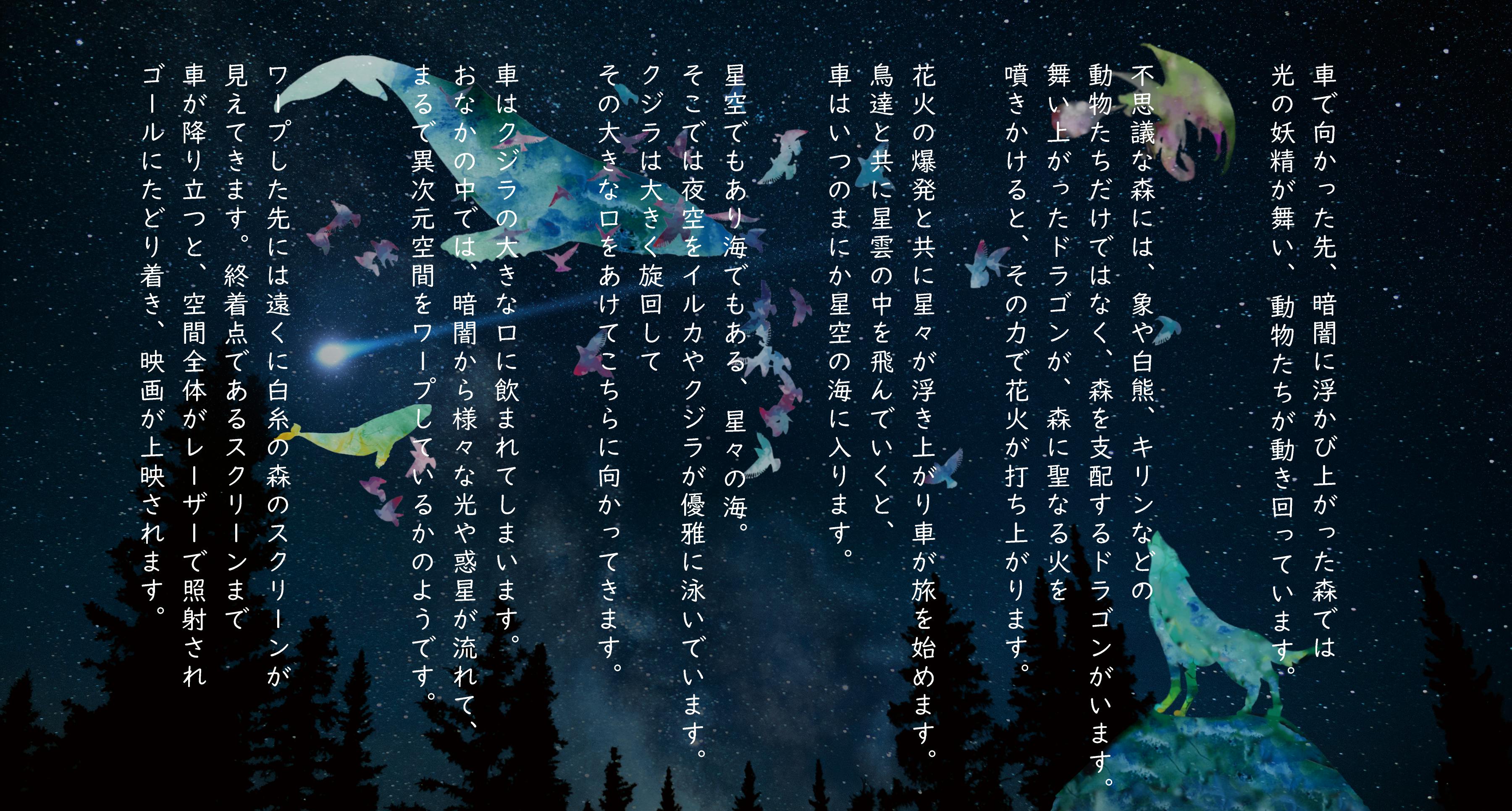映画のプロローグとして流すプロジェクションマッピングのテーマは「星空を旅する車たち」と名付け、森に不思議な動物や妖精があらわれ、車たちを誘います。車は星々の中を旅し、最後はゴールである映画館まで誘われて、そのまま映画の世界に入り込んでいくようなストーリーです。映画の前に非現実な世界に没入することで、より深く映画の世界に浸ってもらえるような演出を考えています。