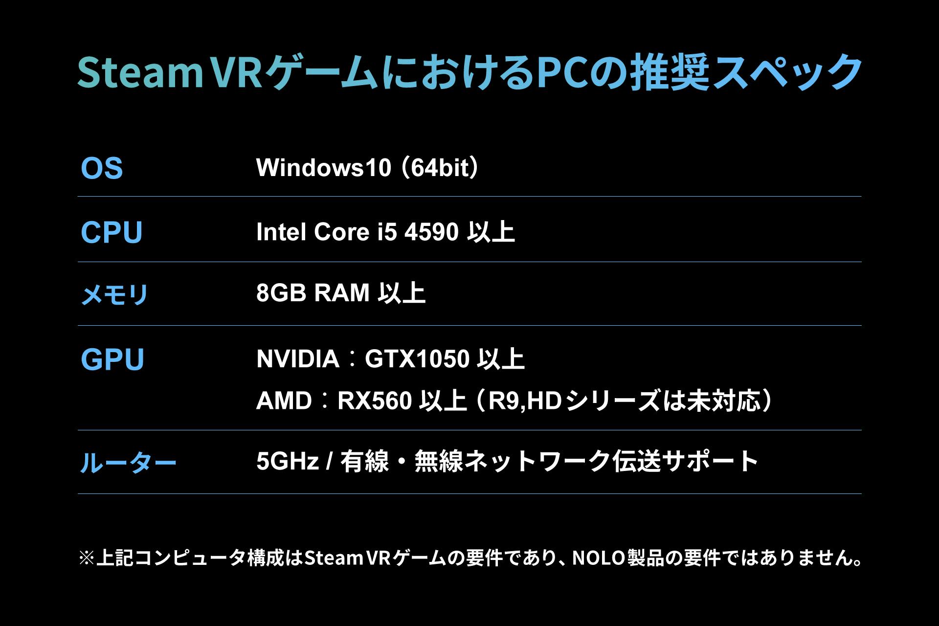 SteamVR系ゲームをプレイするには、推奨スペックを満たすWindowsパソコンとIEEE 802.11ac対応のWi-fiルーターが必要です。(インターネット回線は必要ありません)