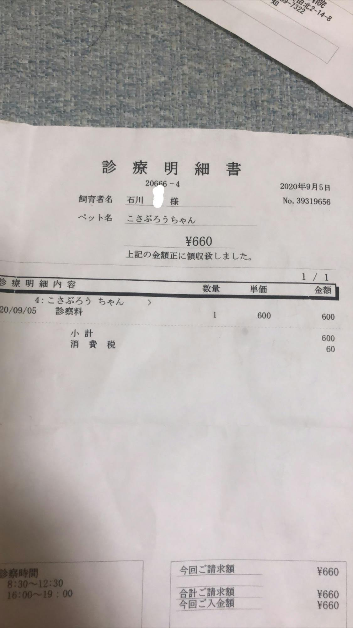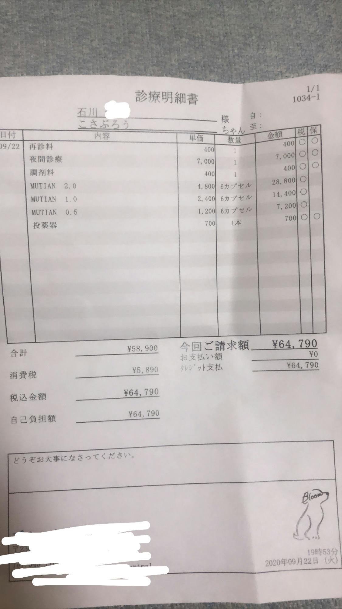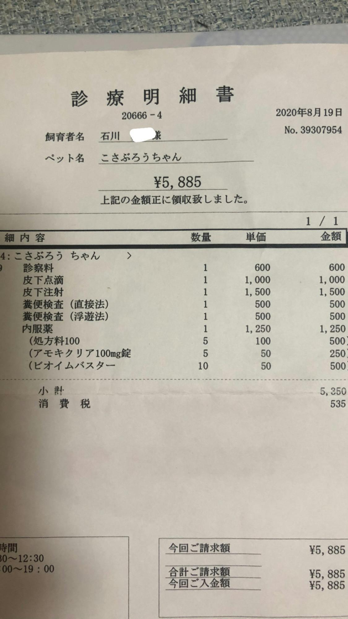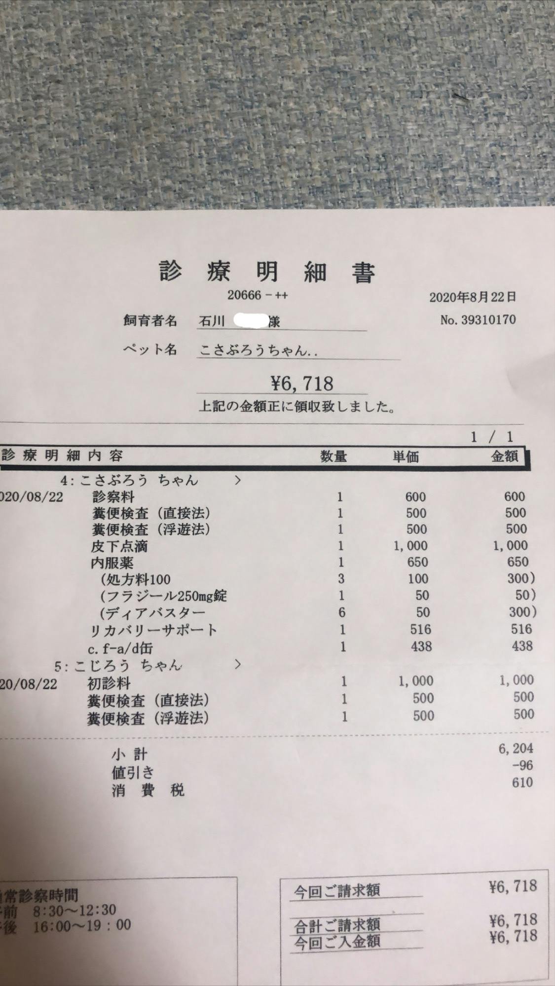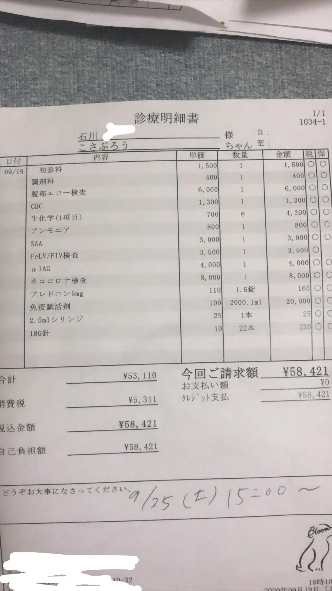 8月22日体調がよくならず熱も下がらないためまた点滴と注射をして貰いました。お兄ちゃんの小次郎は、うんち検査だけして貰いました。このときに先生からFIPの可能性もあると言われて真っ暗になりました。