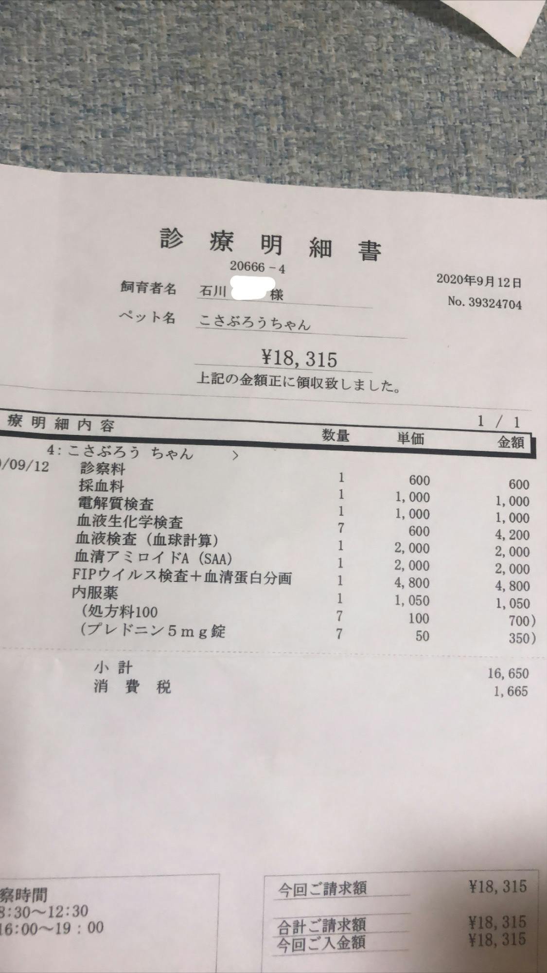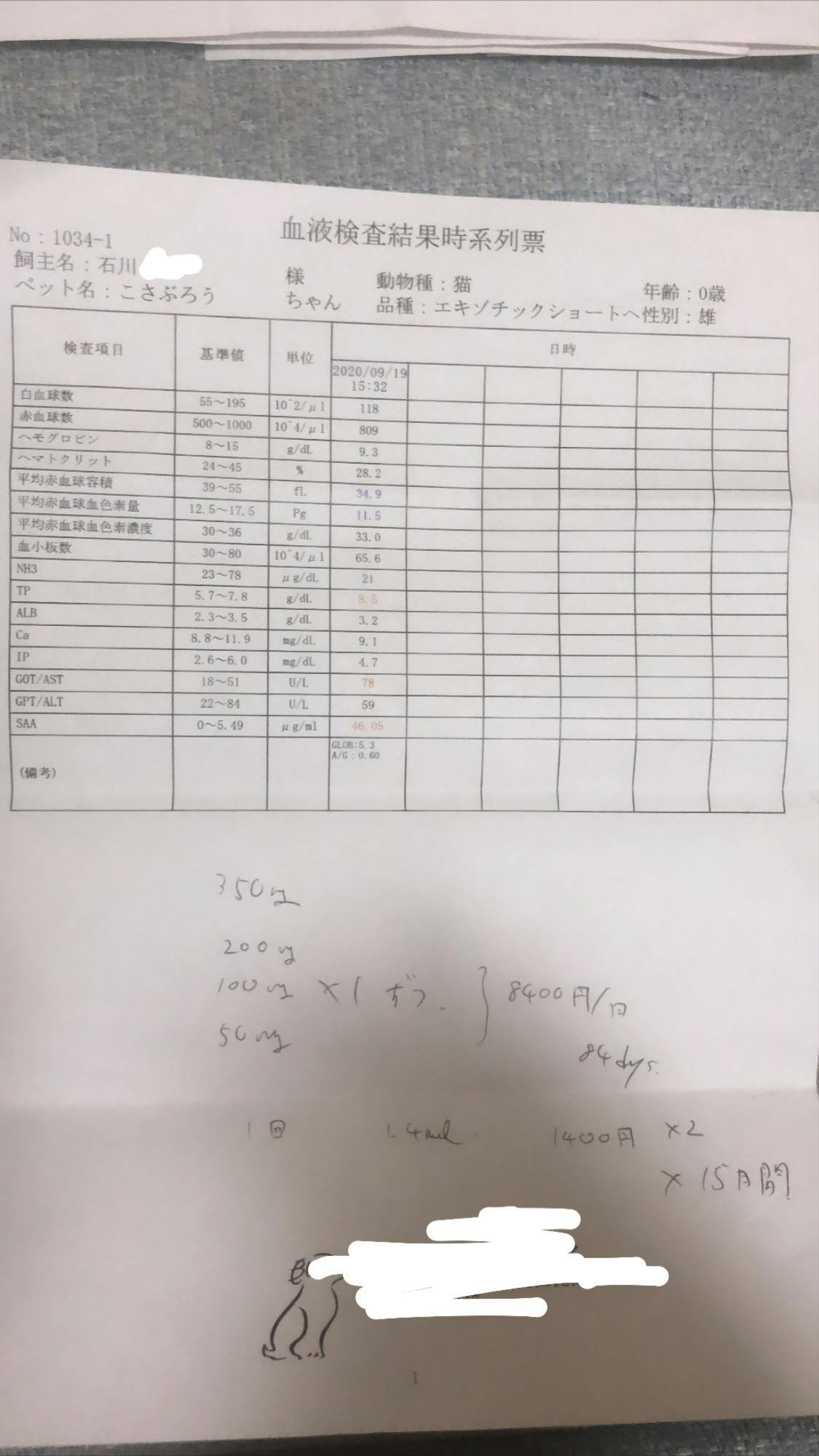 9月12日 また熱が41度まであがったので病院へ。抗生物質も全く効かないとなるとFIPの可能性が高いと言われ血液検査とFIPウイルス検査、うんちの検査をしました。