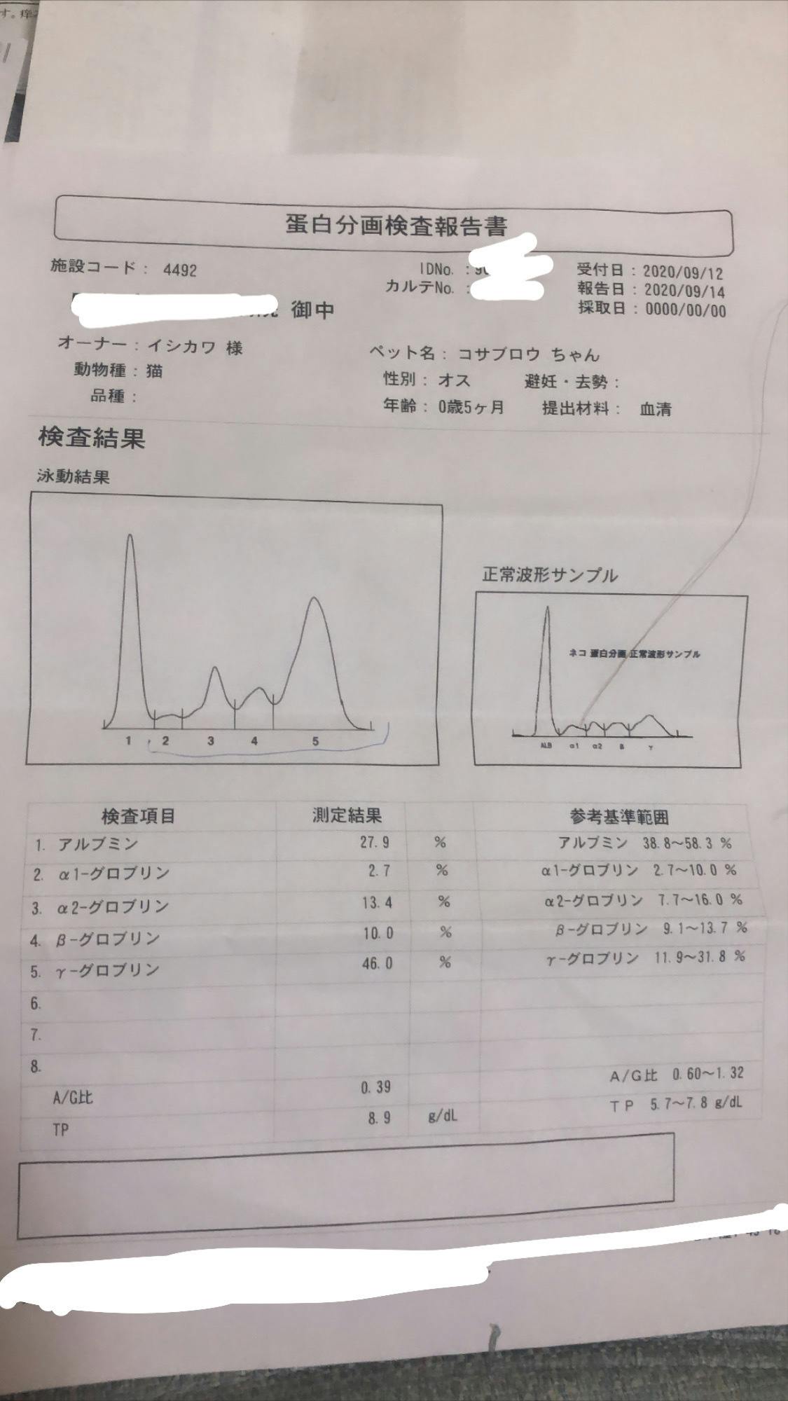 蛋白分画検査では、FIPの波型と完璧に一致してしまいました。
