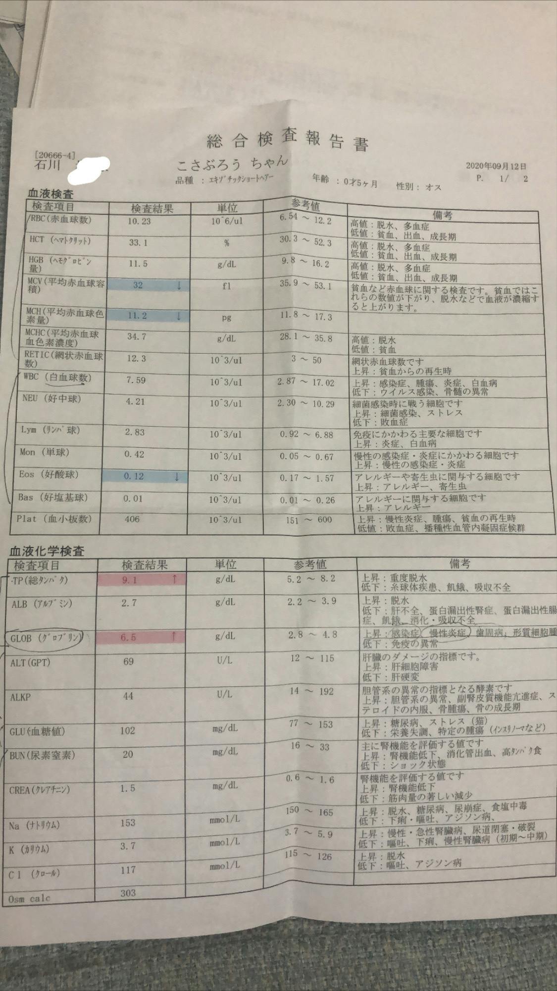 こちらが血液検査です。FIPでよくみられるグロブリンが6.5と高いです。