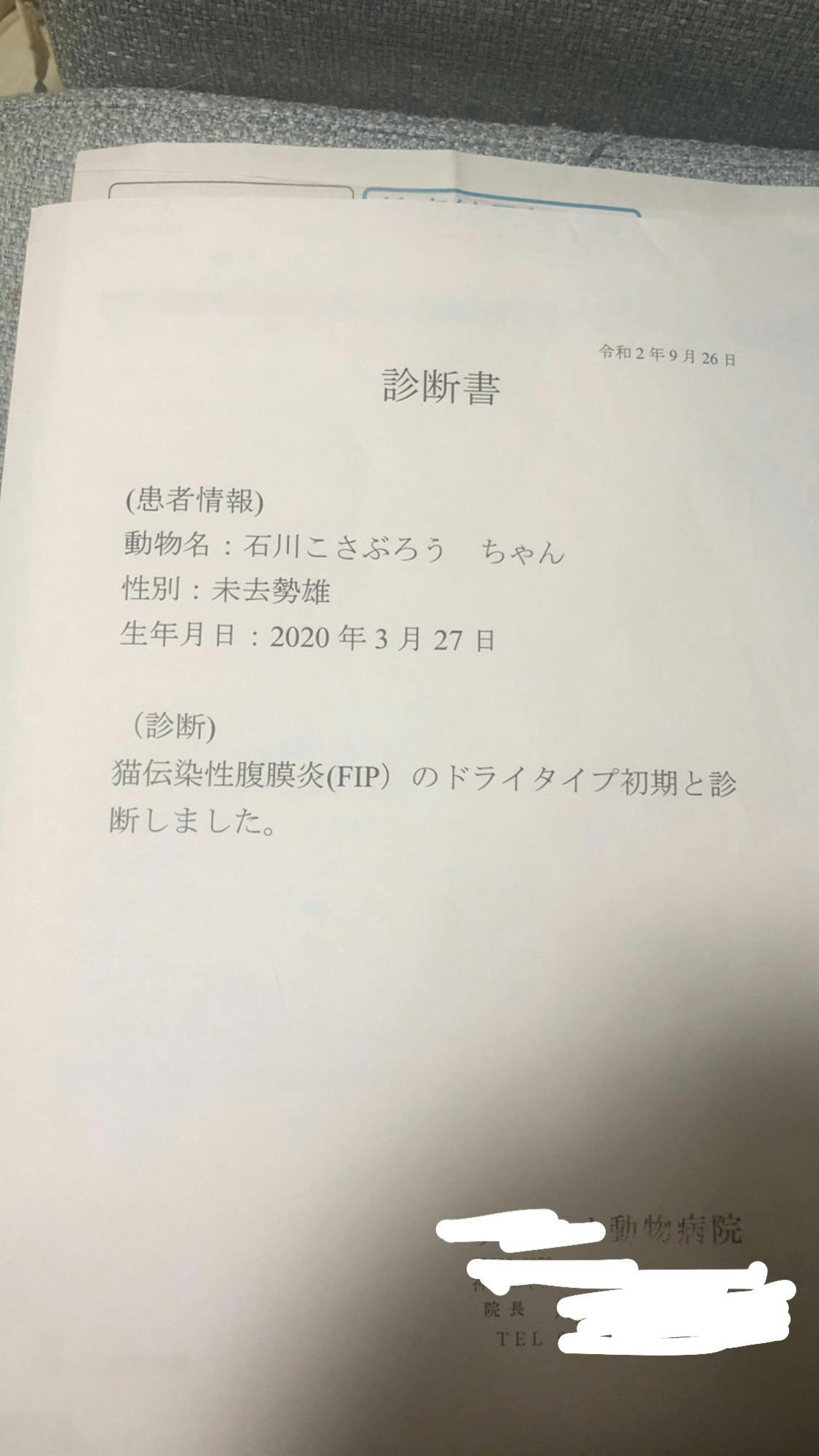 新しい病院の検査結果も症状、全部の検査含めてFIPドライタイプ初期と診断されました。