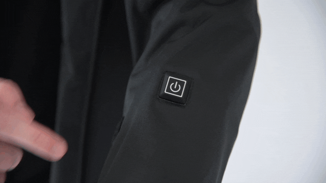 ②ジャケットについているスイッチ(ロングは外側、ショートは内側)をオンにして1秒後には発熱開始。約30秒で最大50度まで発熱し、ジャケットの中に熱を閉じ込めます。