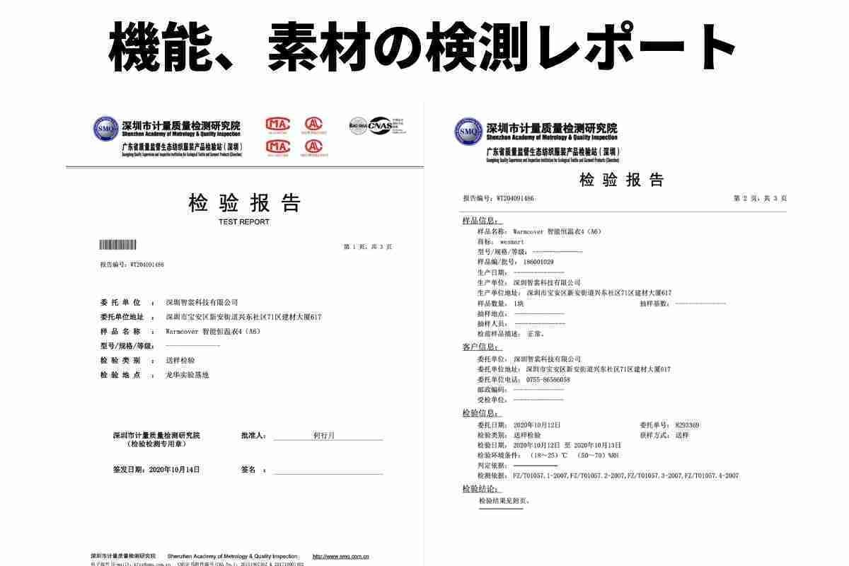 赤外線カメラを使用した実験結果です。パッド部分が51.5℃に上昇し、ジャケット内は42.2℃になっています。まるでお風呂に浸かっている様に快適な温度に保ちます。