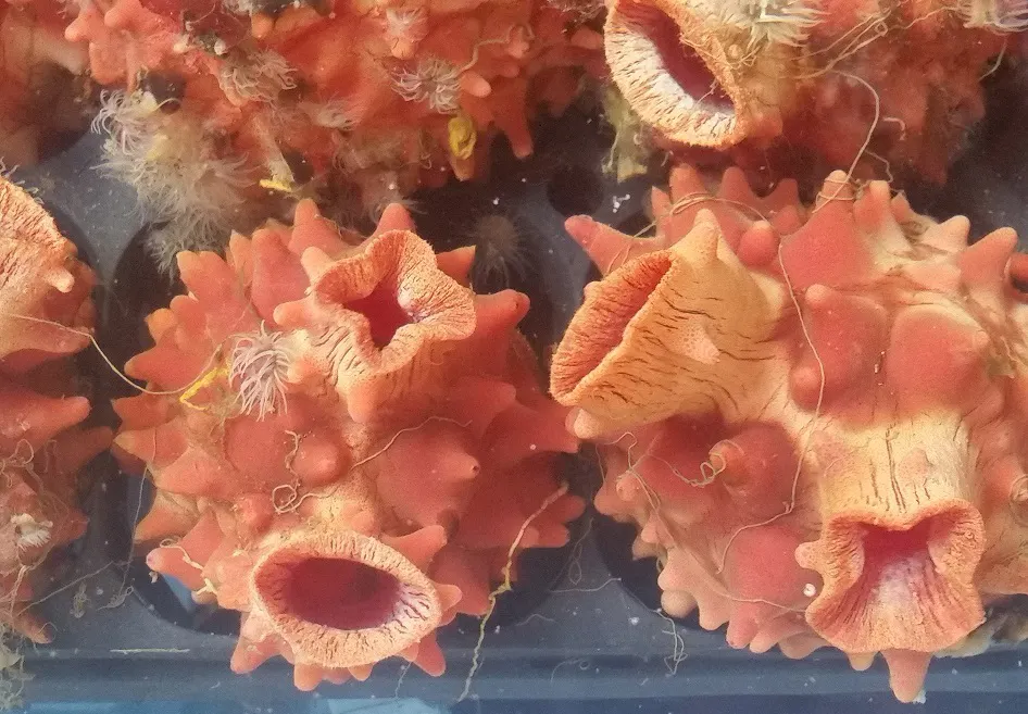 漁港直接買い付けを通じて生産者と交流を持ち、実際の生産の様子を拝見する中で、宮城県独自の高度な養殖技術を知ることができました。季節や養殖年数で養殖棚の位置を移動して最適な生育環境を維持したり、冬の産卵時期を見極め効率的に沢山の卵を採卵する種付け技術なども見学させてもらいました。ほやは殻の天辺にある+-になっている入水孔・出水孔で1日に1トンもの海水を循環しています。そのため三陸の海の豊富なプランクトンが欠かせません。