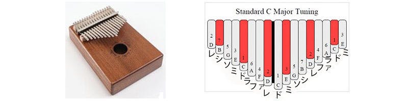 アフリカで開始されたため、限られた単純な音階を持って歌を歌う時のリズム伴奏用に使われた土俗楽器をイギリス人のヒュートレイシー(Hugh Tracey)が対称キー配列に発展させ、世界に普及させたカリンバはペンタトニック(ドレミソーラー5音階)または1オクターブあたりのミ - ファ、シ - ド以外半音がなく、7つの音のみ持っているダイヤトニック(7音階)で構成されています。