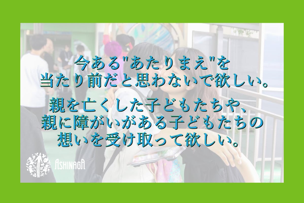 また、あしなが学生募金事務局の局員の多くは、親を亡くしたり、親に障がいがあったりなど、苦しい経験をしてきた学生です。私は長い間、多くの遺児学生からこうした経験を耳にしてきました。だからこそ、彼ら彼女らの想いを背負ってクラウドファンディングを立てました。