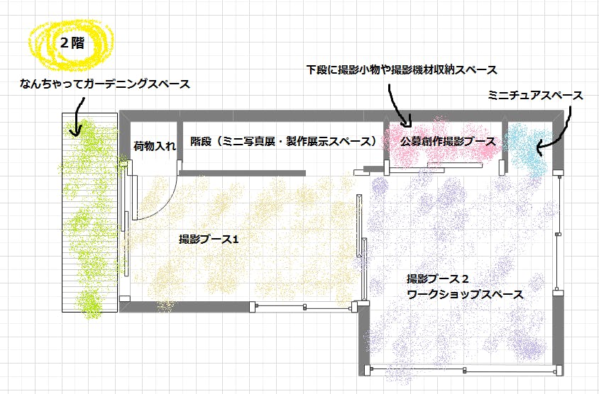 □手前の小さな部屋、奥の大きな部屋ともに撮影ブースを製作し、さまざまな雰囲気で撮影できるようにいくつかのコーナーに分けます。(だいたい3〜4パターンを予定)