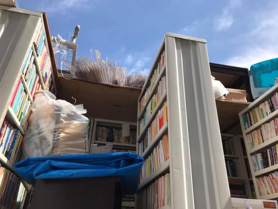 「習志野蔵書センター」は全壊しました。強風により屋根がすべて飛ばされ、残念ながら所蔵していた12,000冊の蔵書のうち1万冊以上を廃棄せざるを得なくなりました。屋根の骨組みとなる鉄骨ごと強風で飛ばされたことを思えば、怪我をされた方もおらず、近隣の住宅・車輛に被害が及ばなかったことは不幸中の幸いでしたが、多くの方よりお寄せいただいた寄贈の蔵書を大量に廃棄せざるを得なくなったことは断腸の思いです。