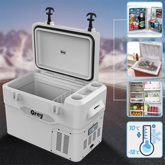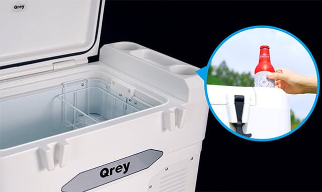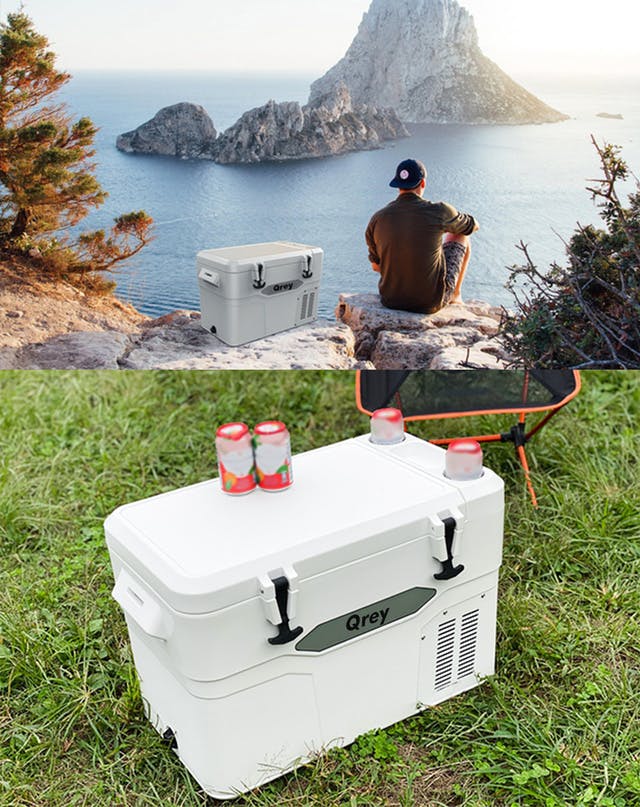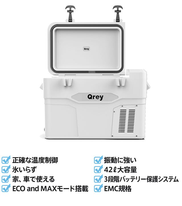 - 【Qrey (キューレイ)42L】は42Lの大容量を誇るコンプレッサー式のポータブル冷蔵庫。省エネ設計で-18℃まで急速冷凍します。