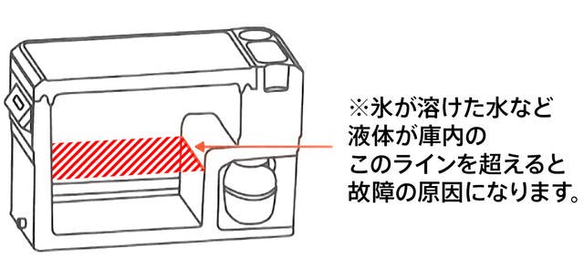 ・溶けた氷の水などの液体が庫内にあるラインを超えると故障の原因になります。