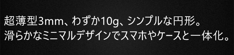 薄さはわずか3㎜、直径57㎜のシンプルな円形。重さは10gと、スマホやケースと一体化し、外付けアイテムとしての存在は気になりません。