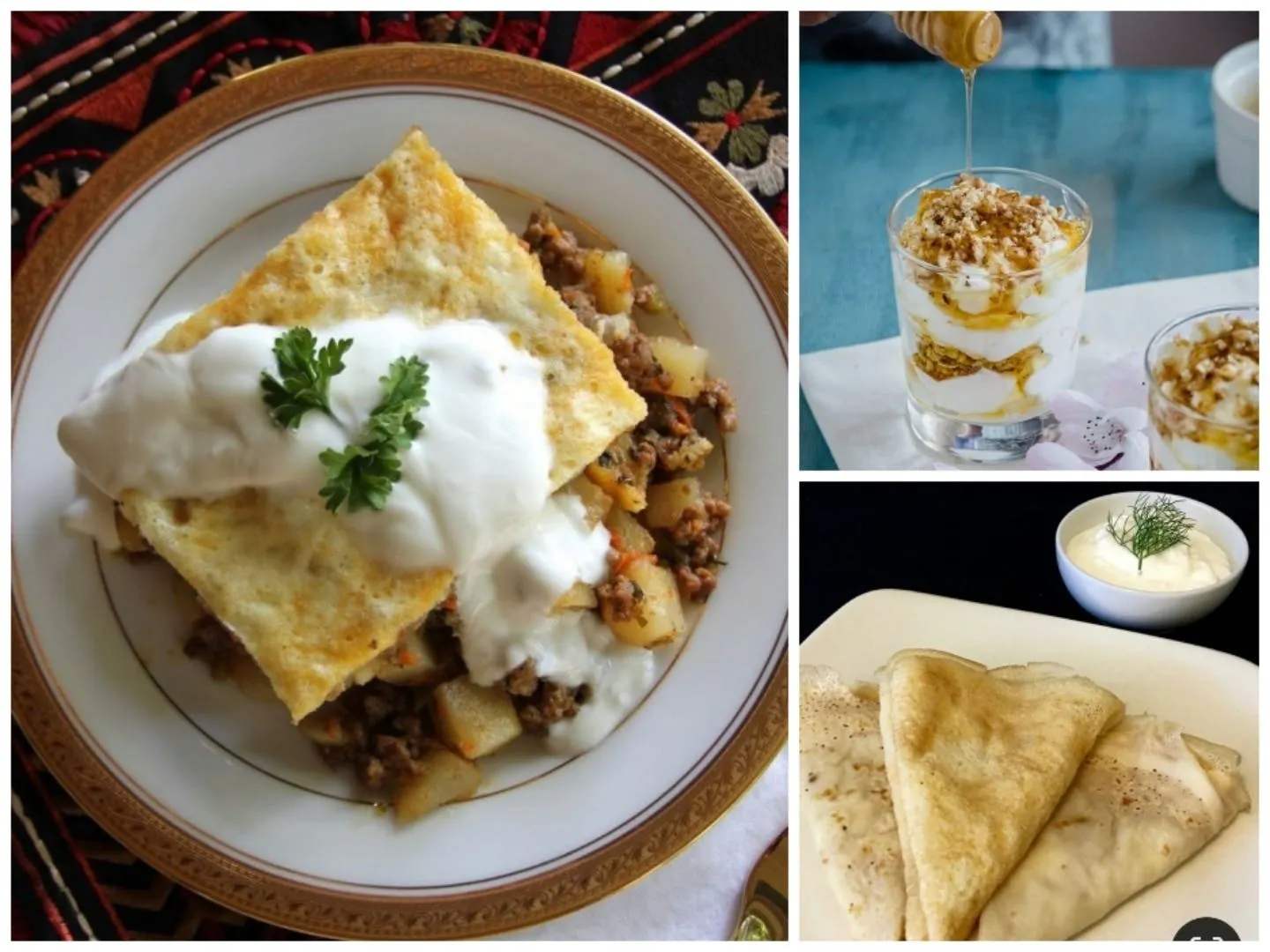 クレープ。朝食のクレープは トッピングとしてチーズとヨーグルトを用い、 デザートのクレープはクルミ入りヨーグルトとはちみつをトッピングとして召し上がります。