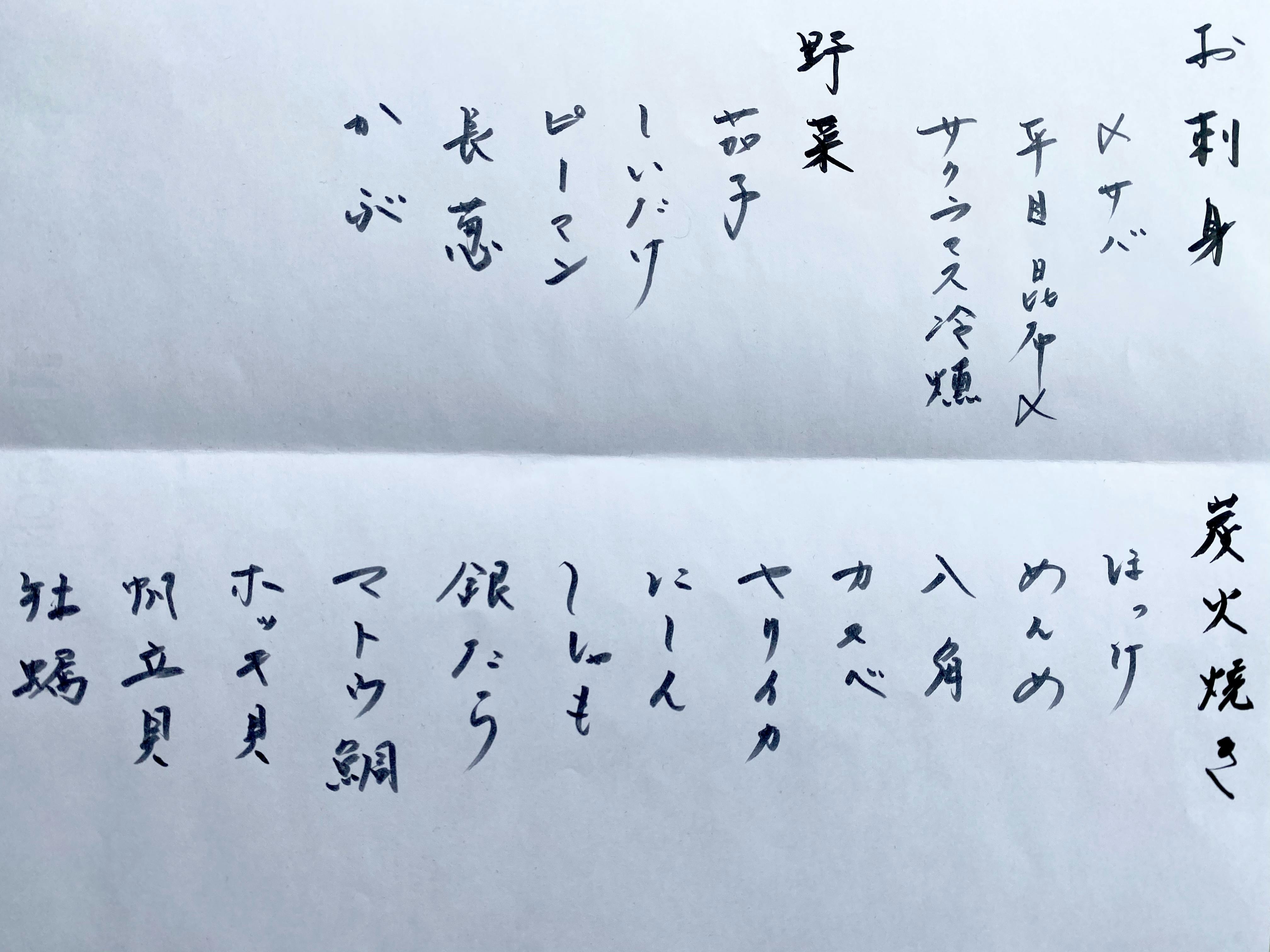 北海道の食材を中心に炉端焼き屋の定番料理は勿論、焼き魚や焼き野菜、釧路の名物料理ザンギや青ツブ焼きはじめ、酒呑みのツボをつく肴、何故かあるワインや生ハムやチーズ。