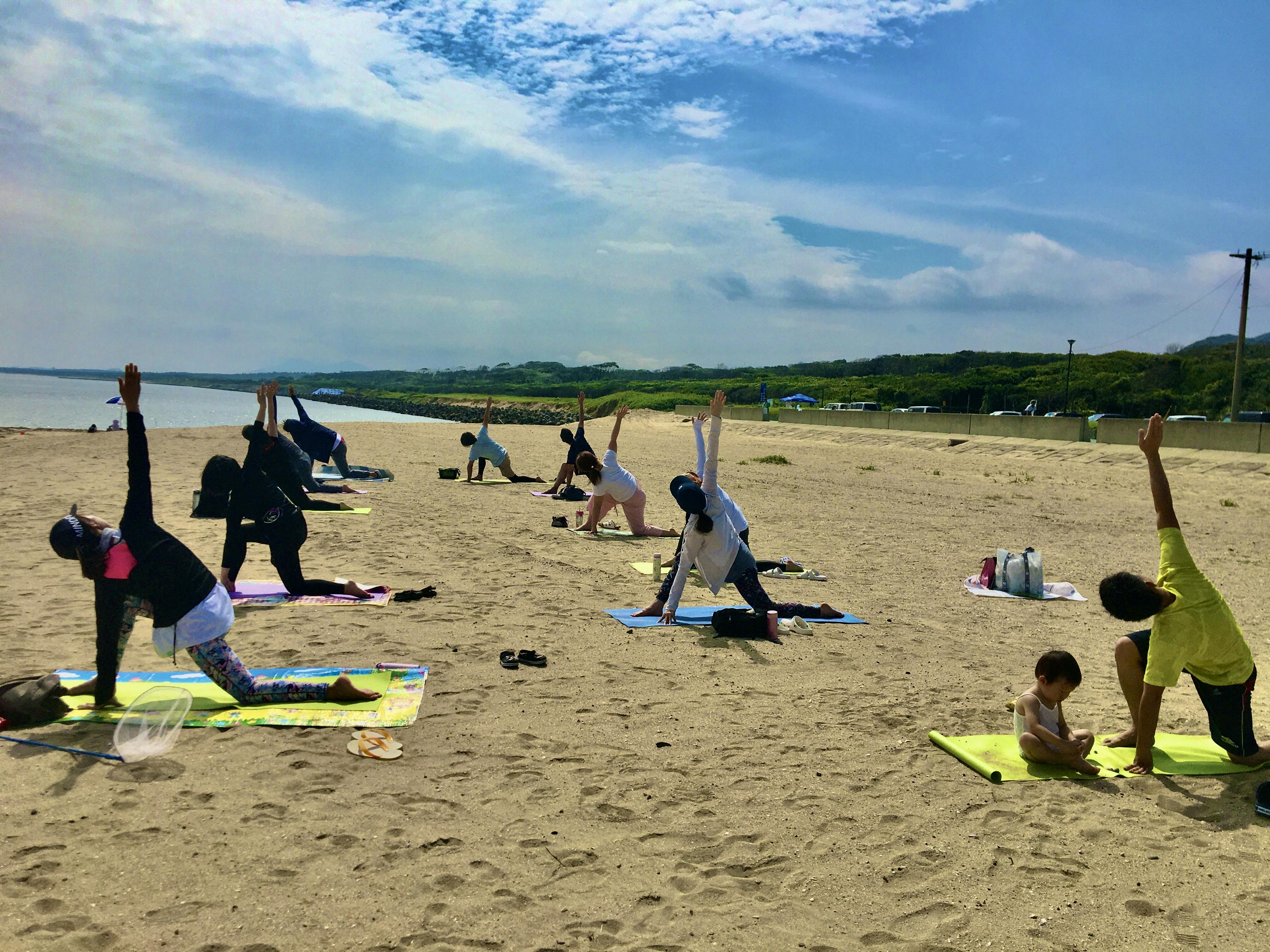 夏の早朝はビーチヨガ!太陽のパワーを全身で感じます。心地よい波の音は、瞑想効果が高まり心穏やかに。