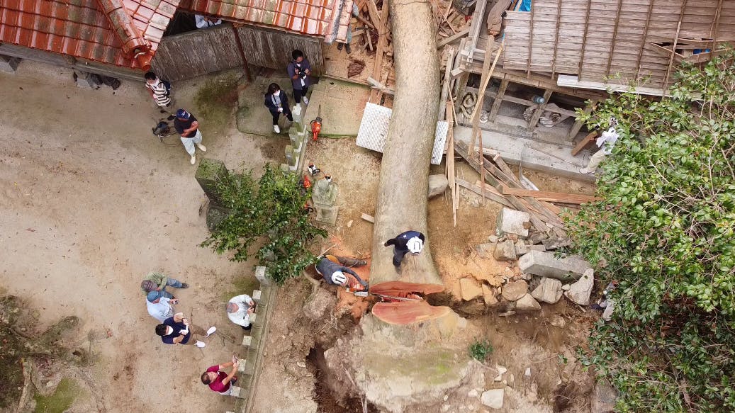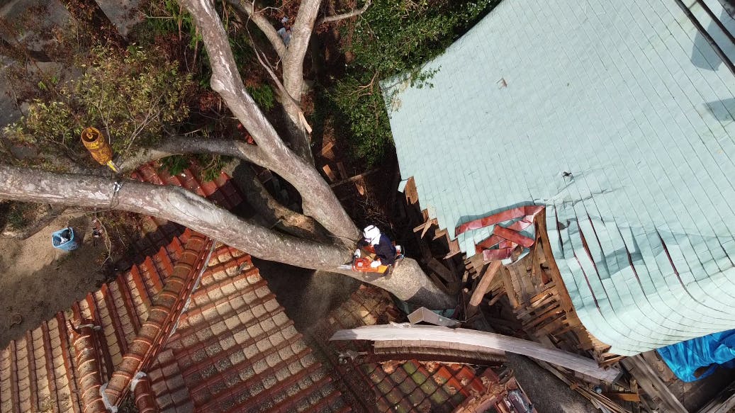 10/2 台風で倒れた欅(ケヤキ)の撤去がしやすいように、八幡西区の中川林業(株)様が周囲の木の枝の除去を行いました。
